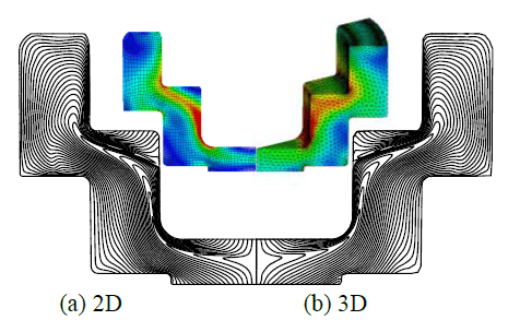 Figure 2: Comparison of metal flow lines obtained by AFDEX 2D and 3D simulations