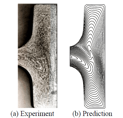 A typical example was found from a hub-bearing manufacturer (4). Fig. 5 compares experimental and predicted metal flow lines generated by automatic three-stage hot forging of bearing parts. It is noteworthy that this example is a typical case of failed process design due to non-symmetric and unsound metal flow lines in spite of the sound surface quality of the forging, particularly emphasizing the importance of forging simulation software.